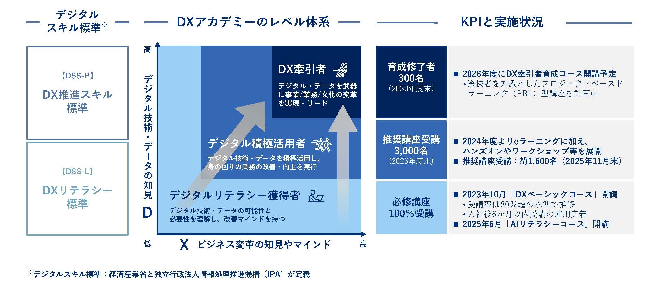 現在、「デジタル積極活用者」の講座修了者や毎年実施しているDX適性アセスメントを通じて把握した1,000名以上の候補者の中から選抜し、DXプロジェクトの企画提案を実践する育成コースを設計中で、2026年度からの実施を予定しています。